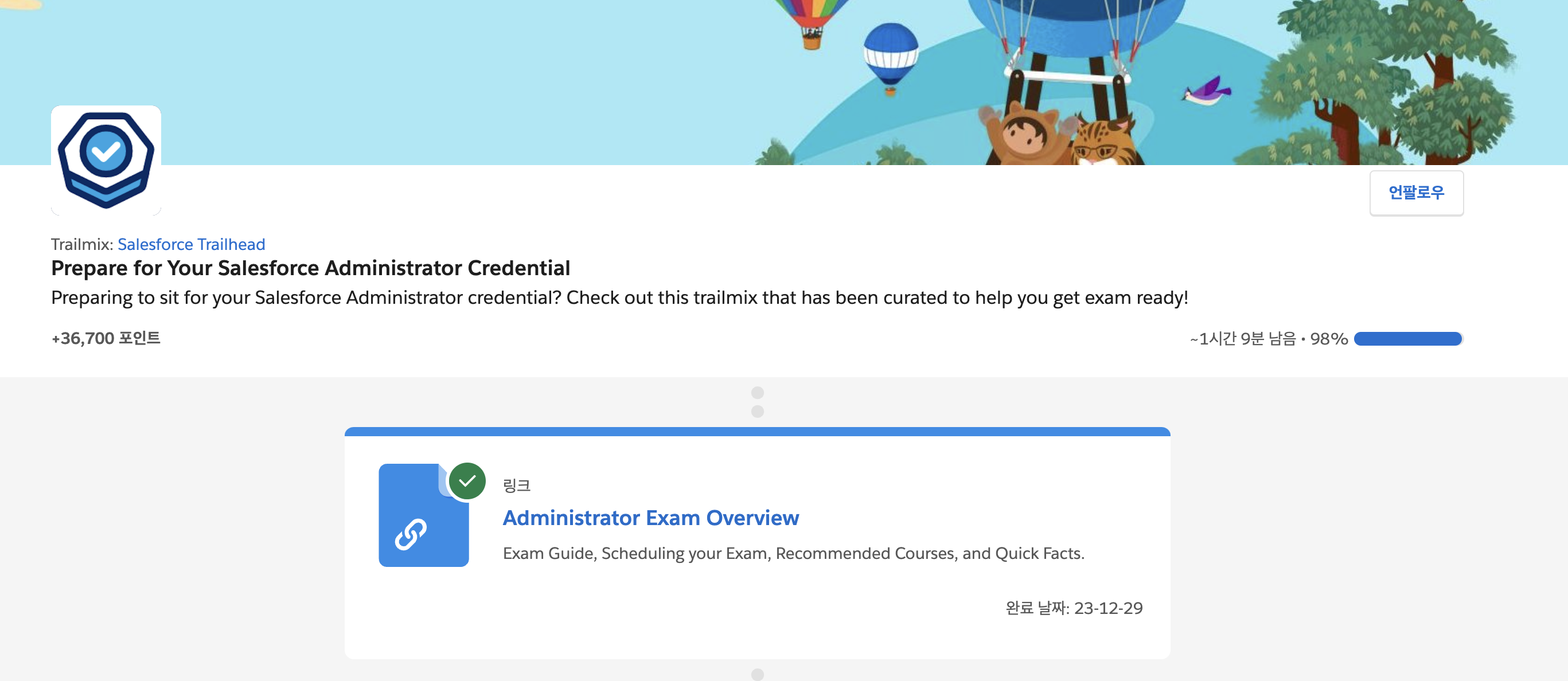 저는 어드민 트레일믹스에서 슈퍼뱃지를 하나 남겨둔 상태라 98% 진행한 상태예요.