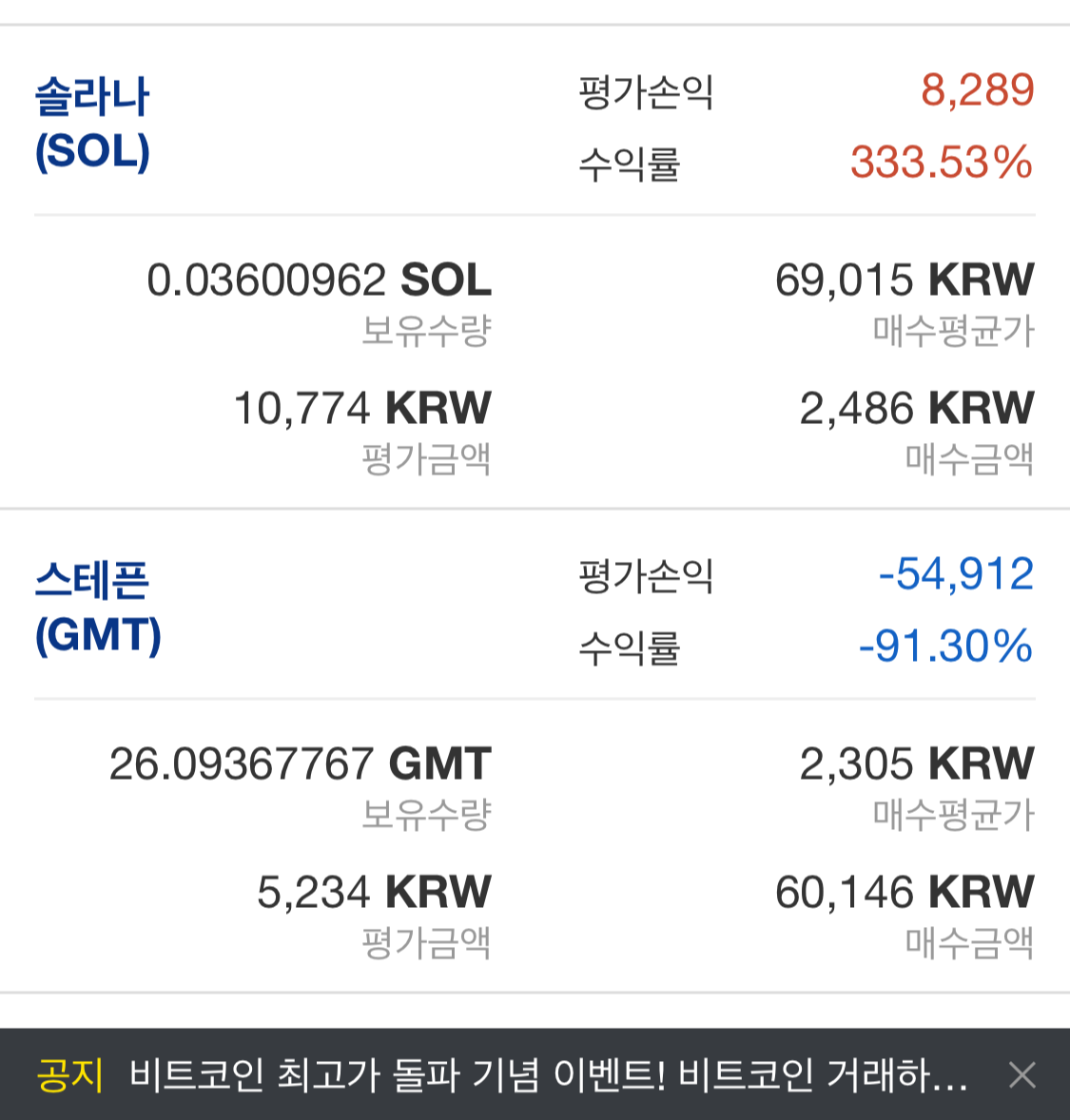 비트코인이 뛰어오르면서 솔라나도 올랐다는 기사가 보여서 간만에 업비트에 들어가봤더니